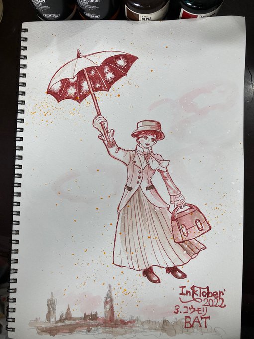 インクトーバー三日目。「コウモリ」でコウモリ傘、メアリー・ポピンズを描きました。ホルベイン・ドローイングインクとアクリリックインクを使用です。 #インクトーバー #inktober2022day3 #inktober2022