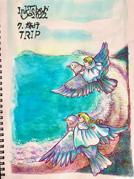 インクトーバー7日目。秋の「ヒヨドリの渡り」。小鳥達が大集団、毎年決まった場所からの海を越える旅をファンタジー風にイメージしました。 #inktober2022day7 #インクトーバー2022 #インクトーバー