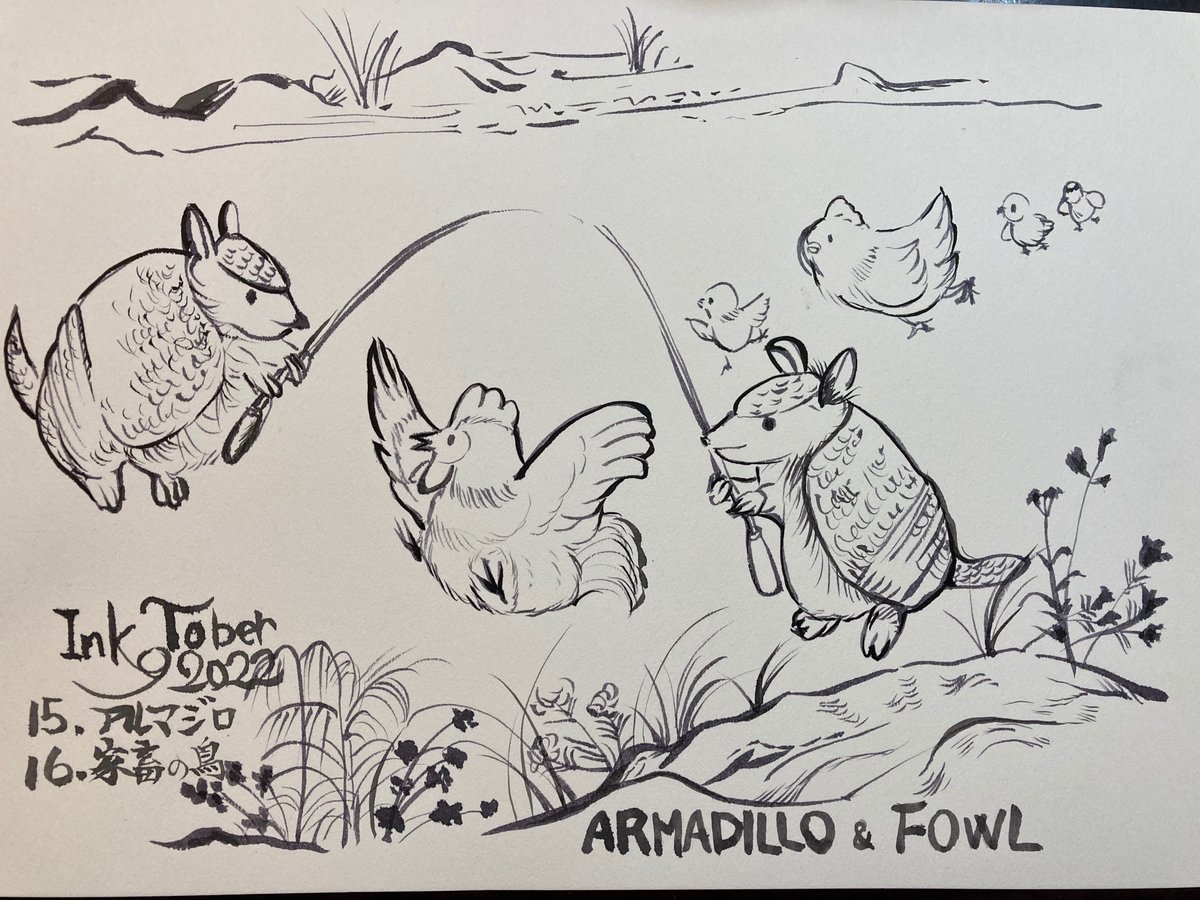 #inktober2022 #インクトーバー2022 #インクトーバー インクトーバー15日目アルマジロ、16日目が家畜の鳥。 平和に楽しく明るく縄跳びで遊ぶ、鳥獣戯画風に。ホルベインドローイングインクのグレイ・開明DRAWING SOLで描きました。
