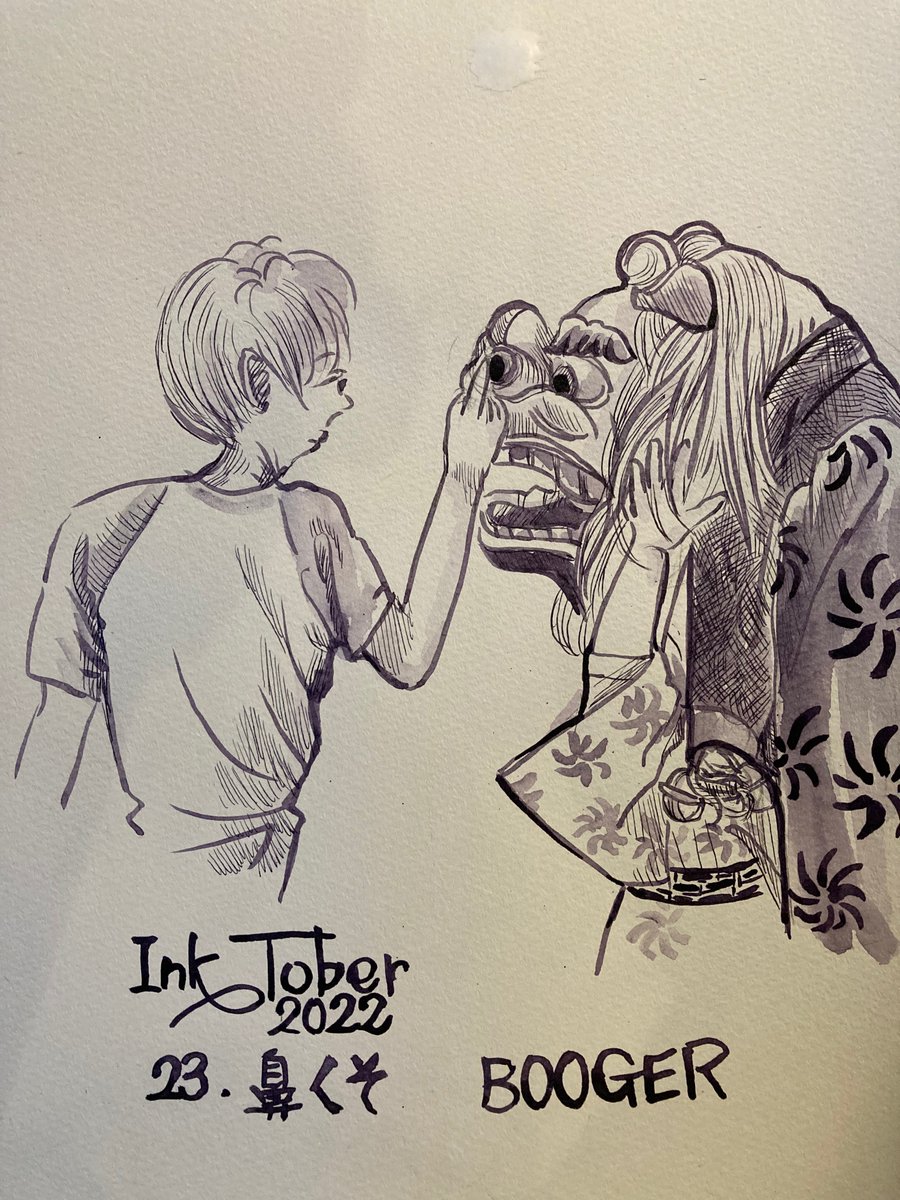 #inktober2022 #インクトーバー2022 #インクトーバー なんとか少し追い付いてきました。お題難しい。 23日目で「鼻くそ」。BOOGER。秋祭りの町内子ども行事、カワイイ獅子舞練り歩きです🥰 そこに穴があるかぎり……👉👃