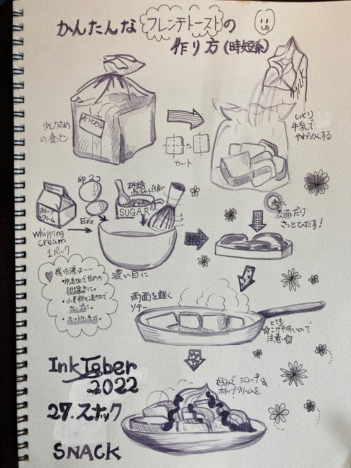 #inktober2022 #インクトーバー2022 #インクトーバー インクトーバー27日目お題は「スナック」 SNACK。 決まった食事以外の軽食も入ると言うことで、時短式のフレンチトーストのレシピです。 フードロスにもお財布にも良いです。 🖌️リキテックスリキッドで🥳