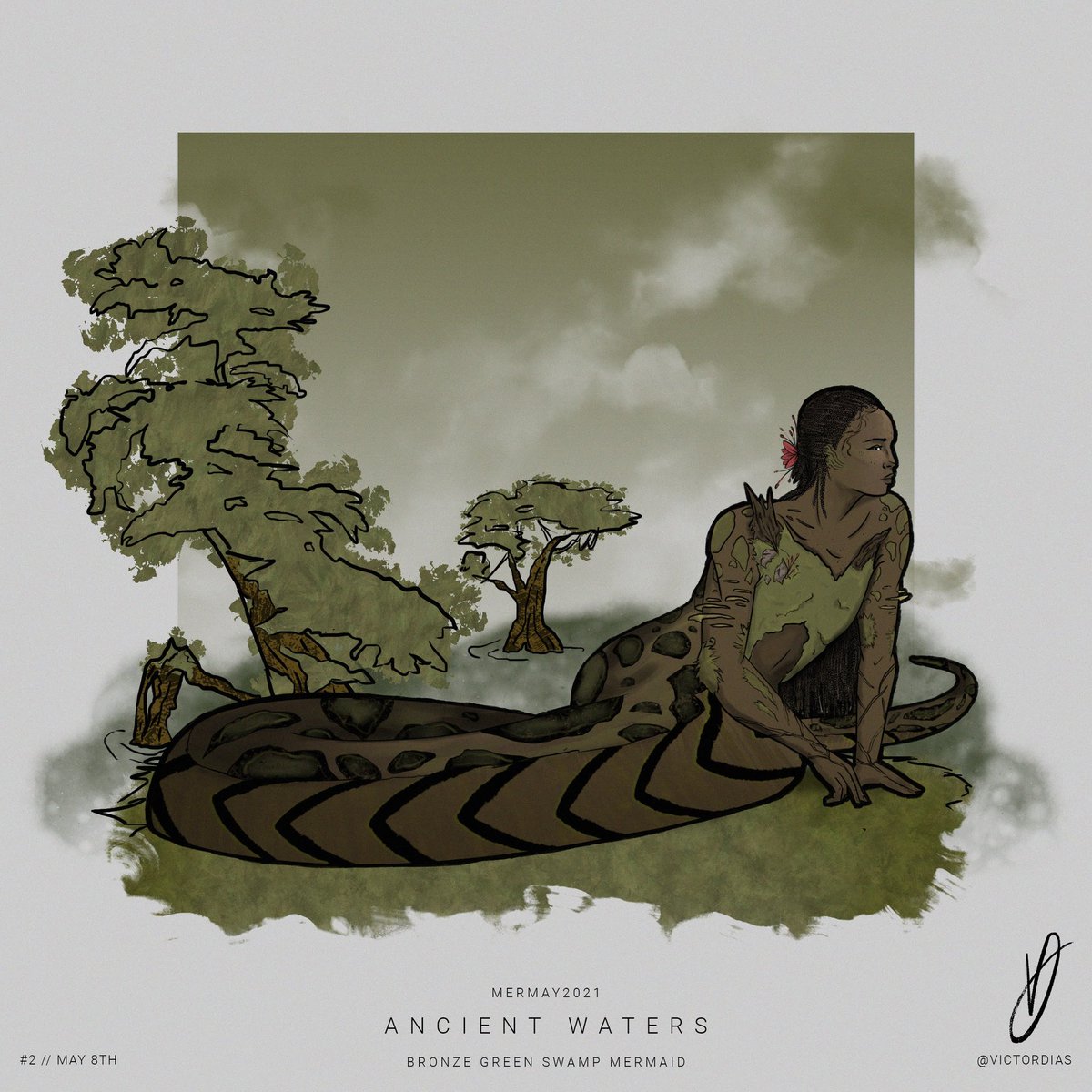 Second entry for #mermay #ancientwaters @albabbgg. Today the theme was Bronze Green Swamp Mermaid. I was inspired, obviously, by elements of this type and ecosystem and animals that live in it, like snakes and frogs, and the face inspired by the iconic Zoe Kravitz. #mermay2021