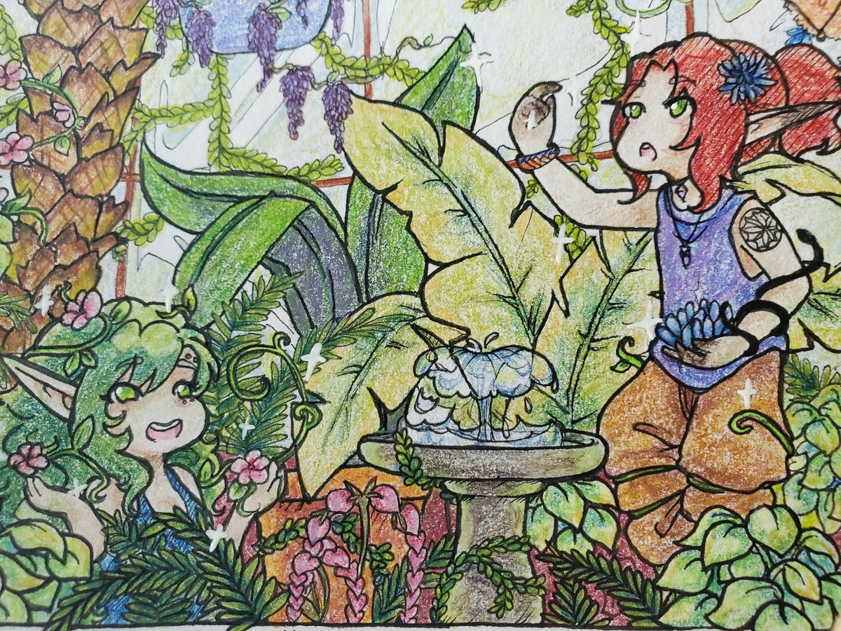 Wow there are many elements to add to green! But im happy with this in how it turned out using #prismacolor. The red head is Lorrean, Orla's brother. The elf woman is Forsythia, and belongs to a friend off Twitter! #witches #greenhouse #druid #originalcharacter #plants #inktober