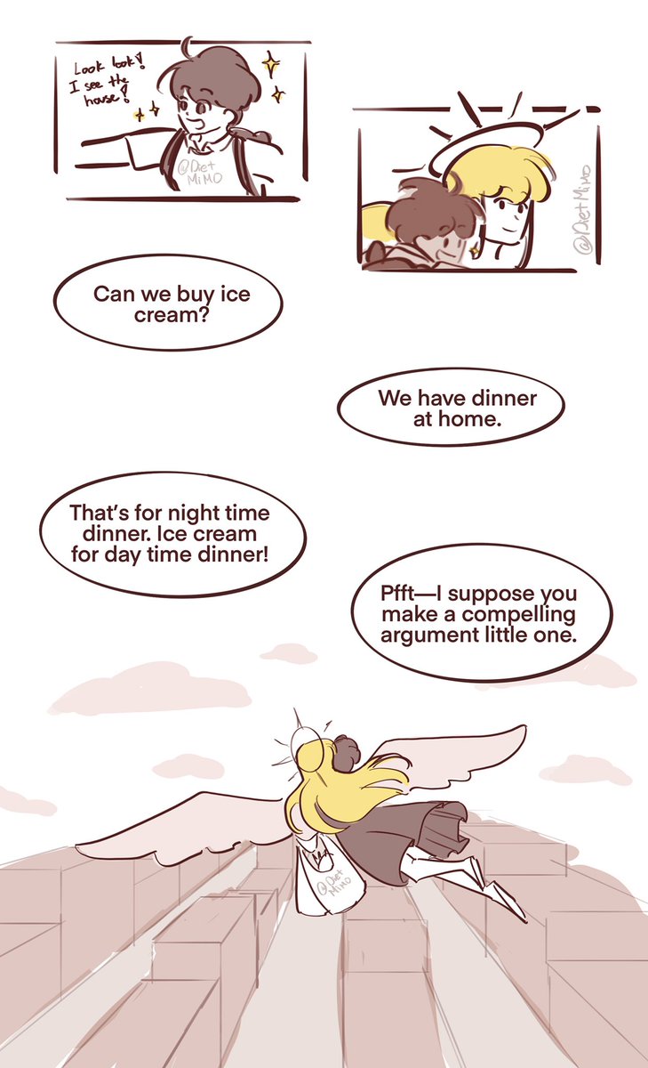 2/3 “Look look! I can see the house from here!” “Can we buy ice cream?” “We have dinner at home.” “That’s for night time dinner. Ice cream is for day time dinner! “Pfft—I suppose you make a compelling argument little one.”