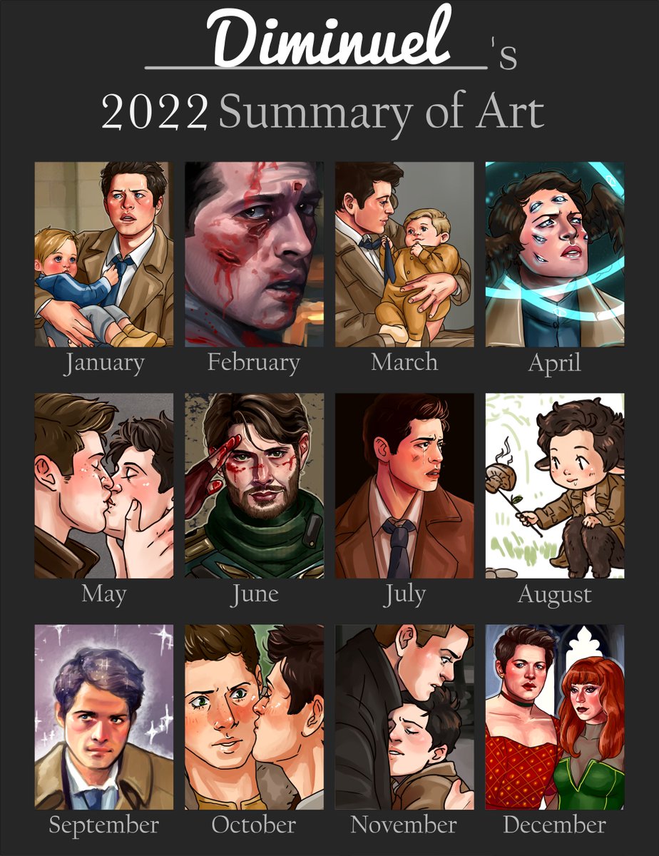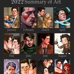 2022 Summary of Art! I didn't draw as much since real life was challenging and I watched easy to digest Sims build videos, listened to podcasts or knitted my first sweater instead of losing myself in art and fic as escapism. Maybe 2023 will be more productive! ♥