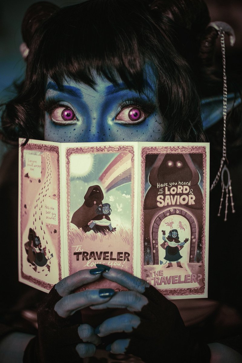 Have you heard of our lord and savior, the Traveler? So happy to be this blue litol tiefling again! Styled a new wig for her and I'm so happy about it! Jester Lavorre is from @CriticalRole created by @LauraBaileyVO #CriticalRole #mightynein #jesterlavorre #criticalrolecosplay