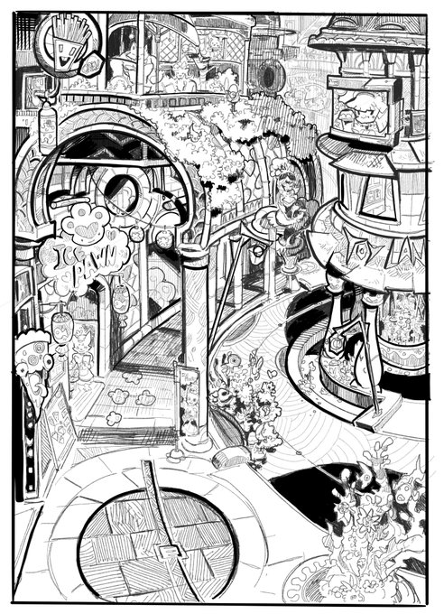 And we lineart @w@ ; next step: add the characters #background #backgroundart #environment #environmentart #conceptart #cartoon #anime #invaderzim Foodcordia - little Earth district #lineart #wip #workinprogress #digitalart
