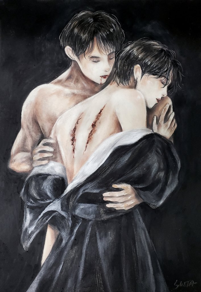 “We have endless time to enjoy this 'meal'... really no need to rush, hyung.” AU: Possessive JK turned himself and hyung into vampires👌🏻💦🖤 #JungKook #SUGA #kookgi #yoonkook #Jungkookfanart #sugafanart #btsfanart