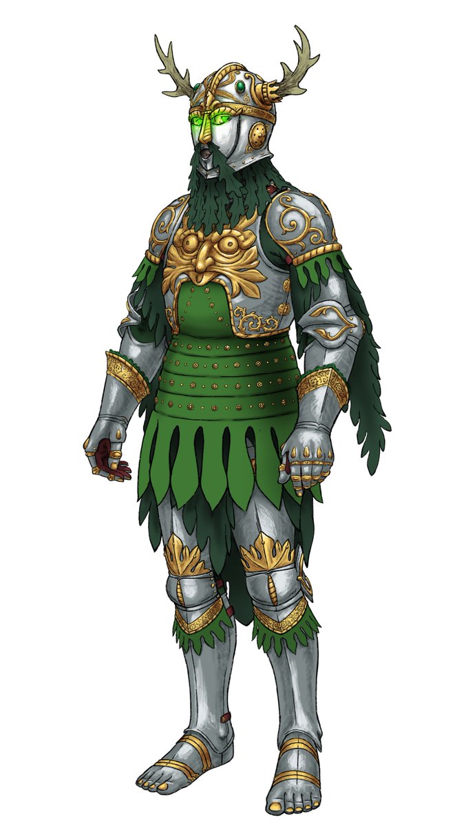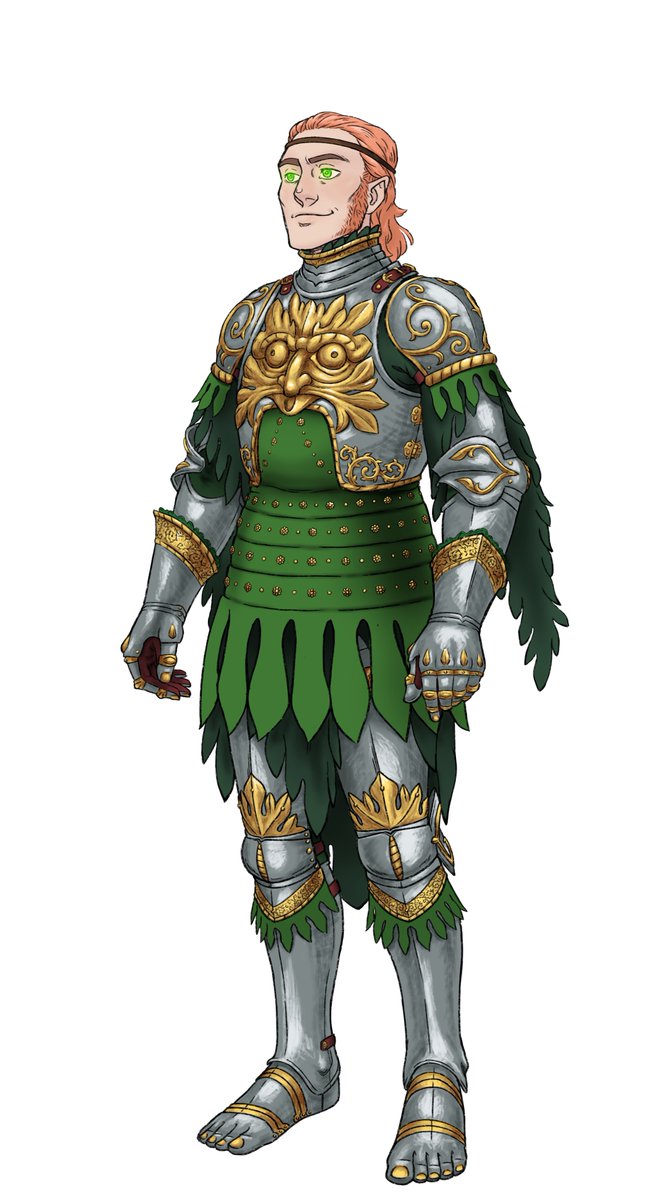 New armor design for my D&D PC Sir Orwain Misal, in service to the Seelie Court of the Feywild. Very much went for Green Man vibes for this harness, and pretty happy how it turned out. #artistsontwitter #knights #fantasy #armor #design #characterdesign