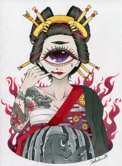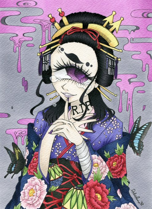#今年も残りわずかなので今年一番伸びた絵を貼る こちらのイラストでした、多忙な中少しでも丁寧に描けるように心を込めて向き合った、かなりお気に入りの1枚ですね、沢山の方に見て貰えて本当に嬉しいです、いつも有難う御座います!🦋 単眼花魁さんこれからも沢山描くぞー!