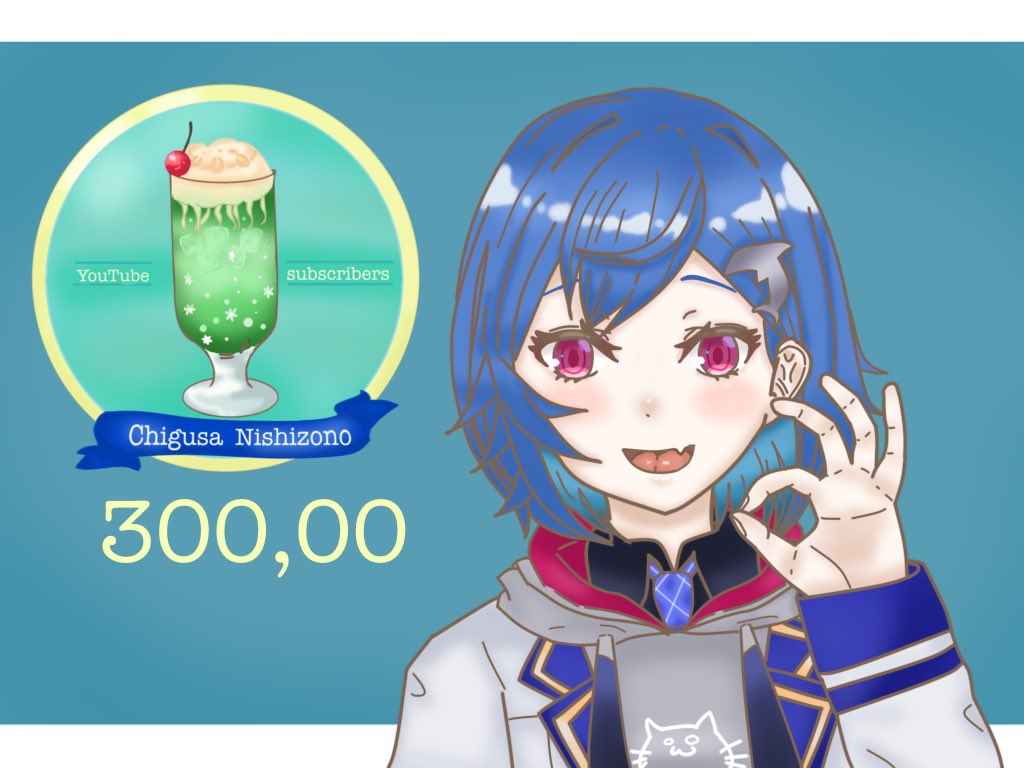 チグちゃん30万人達成おめでとう!! これからもチグちゃんとちぐにゃーさんと一緒に色々な景色が見られますように😊💙 (イラストはチグちゃんの👌も入れて30万人になるように!クリームソーダのアイスを海月にしてみましたー) リプに透過差分あります!! #ニシゾノート