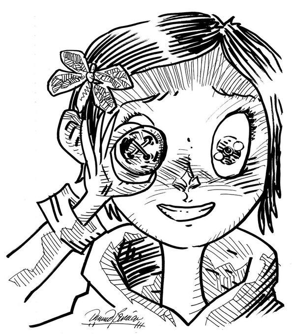 did this first thing this morning, last thing to scan tonight. ah!! enjoy! CORALINE!!! -dominic. :) #FanArt #Contest - #INKxLAIKA19 #INKxLAIKA2019 #Coraline @neilhimself @LAIKAStudios @inktober #InkTober2019 #InkTober #Art #Illustration #StopMotion #Animation needs more yellow!!!