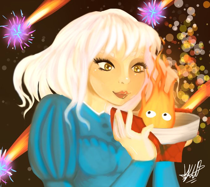 Sophie and calcifer fan art! I worked all night on this. Even tried new techniques. My coms are open and lines starting at $10 to straight watercolor and shading $20 (usually $25) and I work with your Budget. Can't buy? Retweet! It goes a long way. #commissions #FanArtFriday