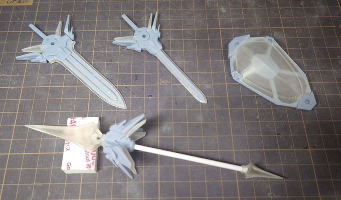 新バージョンの剣と盾 片手剣をベースに大剣化もできるように 槍は3ミリ軸を接続して使えてクリアパーツマシマシに 盾もフレームを3分割して後にカラーバリエーション出来るようにしました 槍はビットとしても使えそうだから色々できそう 天才か…? #メガミデバイス