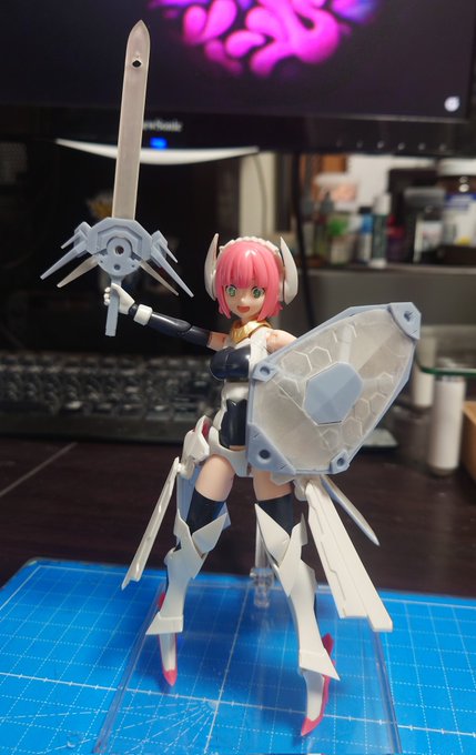 9 16 剣と盾 最新バージョン これで出力時の問題ともおさらばだぜ! 形状的には色次第でファンタジーにもサイバーにもできる感じで 腕に固定するパーツもBK用とメガミ汎用の2種類を制作したのでだいぶ遊べるかなと #メガミデバイス 23/06/29 22:09