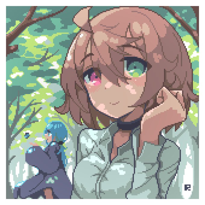 61 392 ミニキャラ練習で描きました〜 いつも背景で悩む🙃 #dotpict #pixelart #ドット絵 22/02/26 12:10