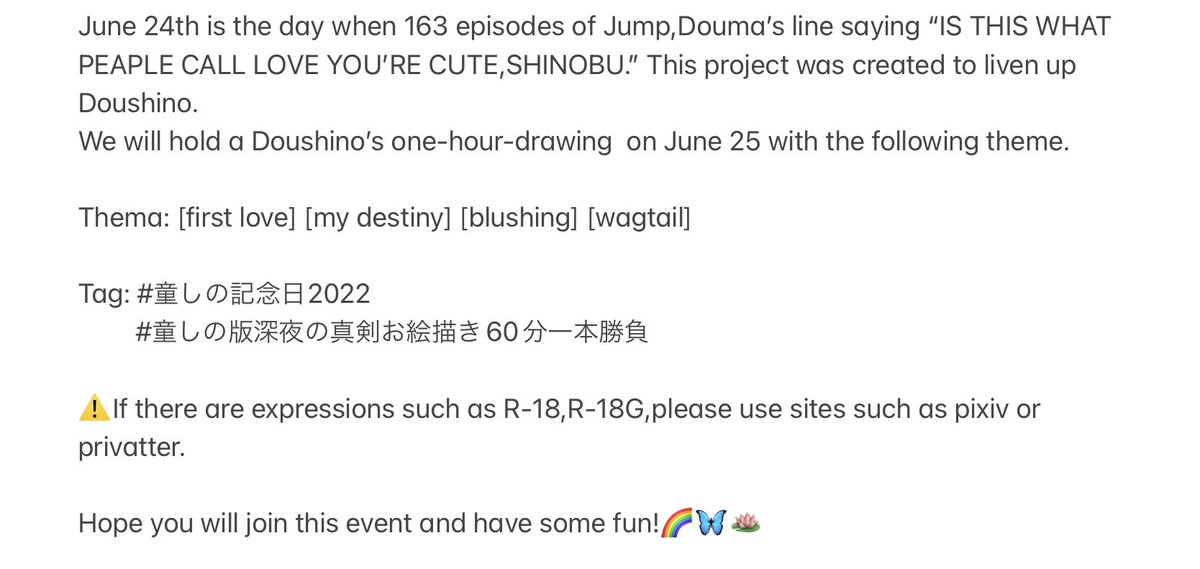 Next "Douma × Shinobu" one hour drawing is planned to collaborate with "#童しの記念日2022". 6/25 (Sat) 22:00-23:00(JPN) #童しの記念日2022 #童しの版深夜の真剣お絵描き60分一本勝負 👇Details are written in the image.👇 🌈🦋