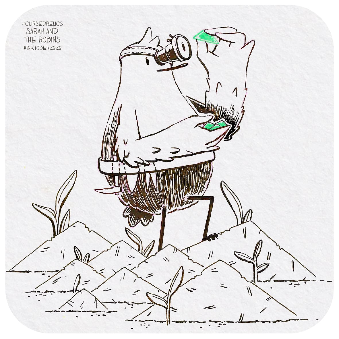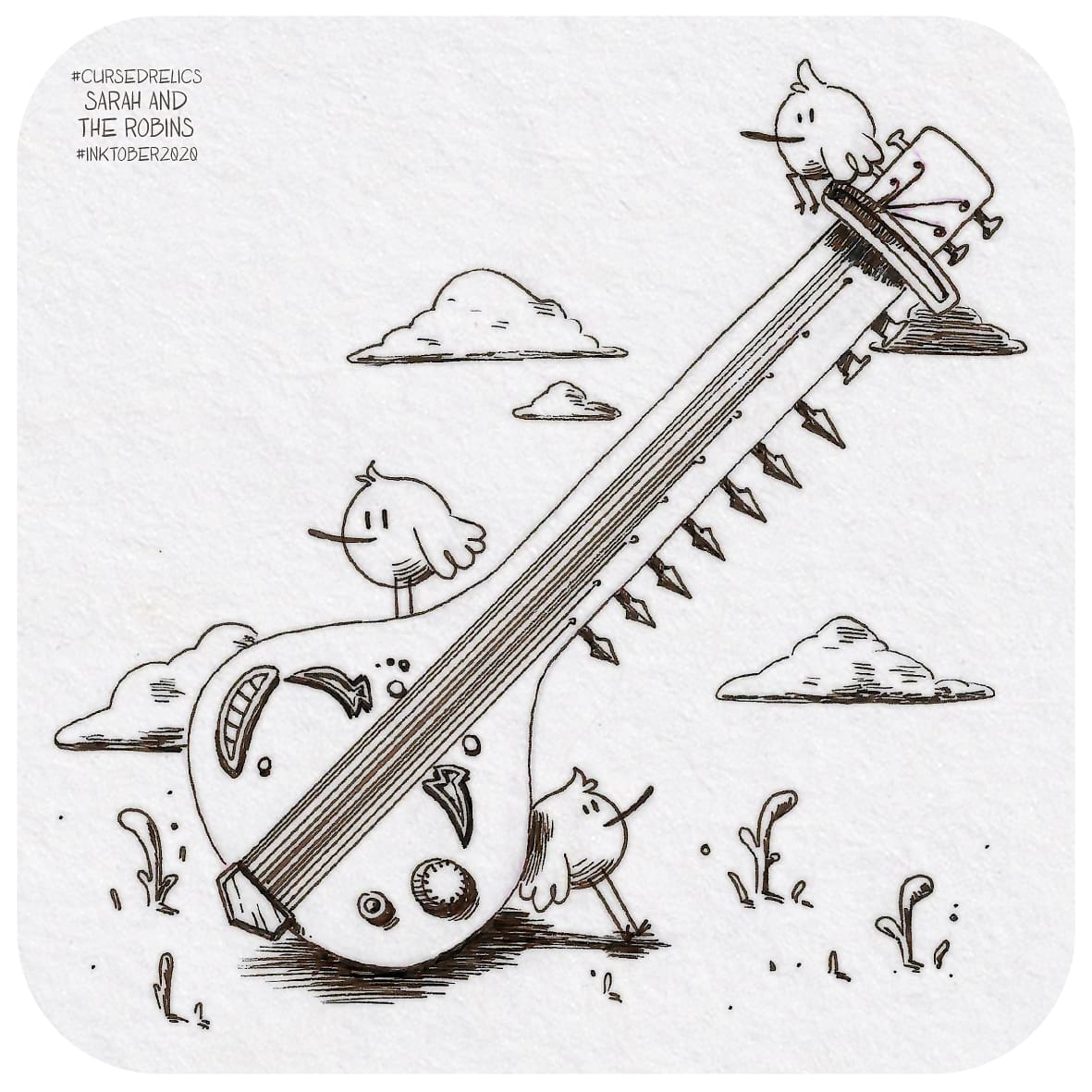 "What is this big and intriguing instrument?", thought the three little robins.🎶🎵🪕 🐦🐦🐦 . . . . . . . #inktober #inktoberlist #inktober2020 #ink #traditionalart #traditionalartillustration #sitar #cursedrelics2020 #farbercastell #farbercastellpittartistpen #sarahandtherobins