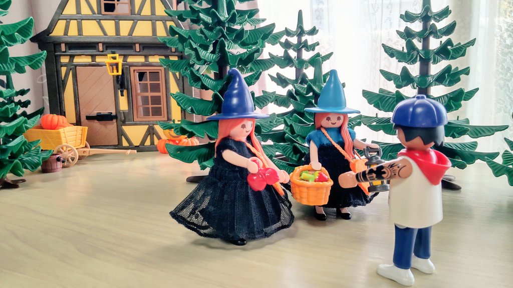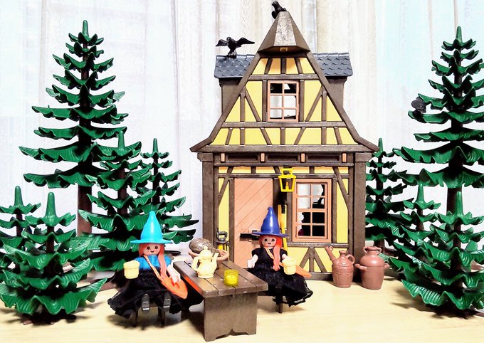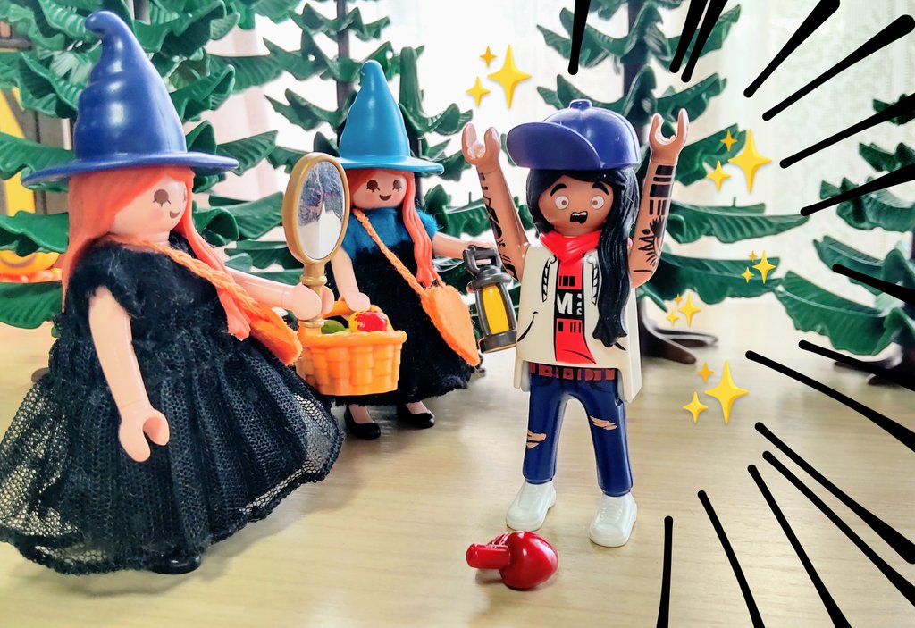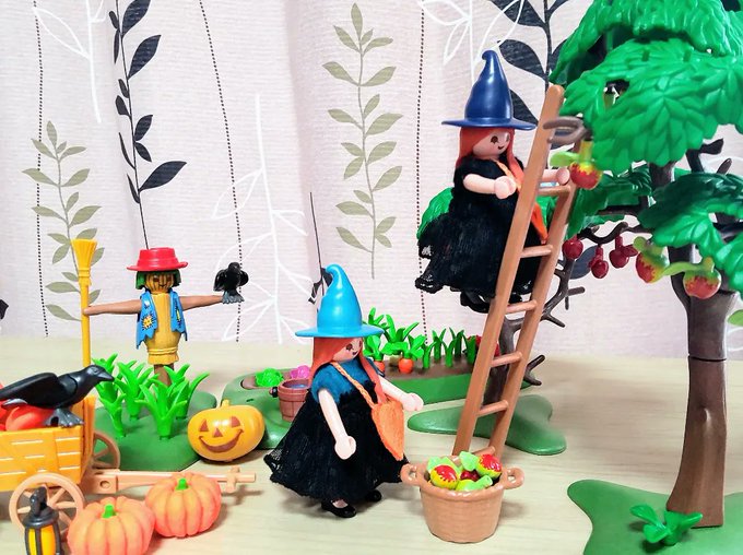お家の裏にある畑でりんごを収穫して、何やら怪しげなものを作る双子の魔女さん🧙♀🧙♀ 🧙♀「何か良いことが起こるかもしれない魔法のりんごはいかが?」 👨「面白そうだから1つください」 一口食べると… 髪の毛がめちゃくちゃ伸びた!!!! やったね👍 #playmobil #プレイモービル #オモ写