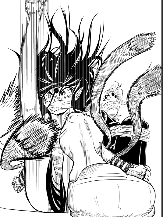 仕事中思いついた紗鵺の髪の毛攻撃を帰宅してスグPC立ち上げてアウトプットrkgk~っ💨 仕事中結構漫画の事やイラストの事考えてます😆 今晩も猛烈に修行するぞっ🤩