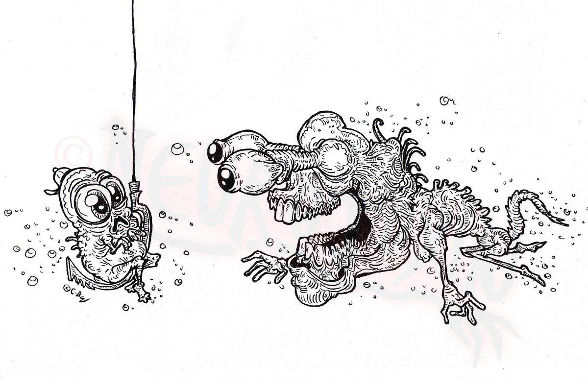 2 4 #Inktober day 3- "Bait" #Inktober2019 #Drawlloween #originalart #creature #bait #fishing #creepy #eyes #teeth #fantasyart #horrorart #characterdesign #monsters #aliens #artforsale #freelanceartist #traditionalart #illustration #penandin #rotherhamiswonderful #southyorksbiz 19/10/04 02:11