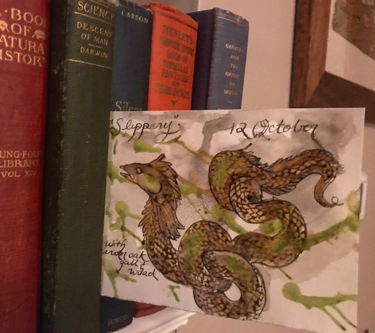#slippery for #inktober #inktober2020 day 12. What if Loc Ness is just a big ol' eel? What then? With #homemadeink from alkalized #woad and #irongallink I made last year from California live oak galls. #botanicalpigments #naturalpigments #organicartist #eel #drawing #drawtober