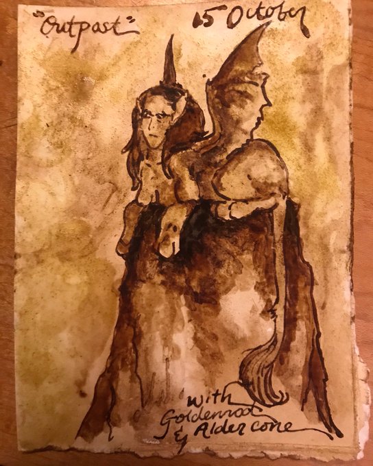 All about the native species inks with this one... Alder cone & goldenrod #homemadeink for the #inktober #inktober2020 #drawtober prompt today #outpost. A #sphinx. The black colour is from an iron solution I dripped on the alder ink. It reacts with the tannin and turns black!