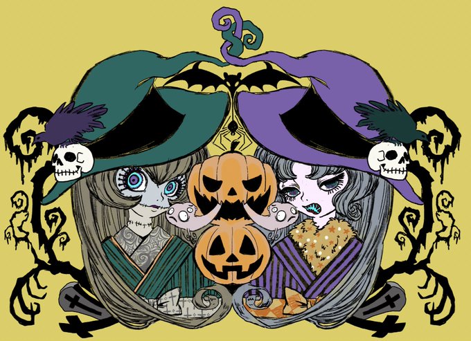 5 19 #ハロウィンイラスト展示会2021 滑り込み! 和装魔女が二人。去年のイラストもおまけに。 21/10/31 23:44