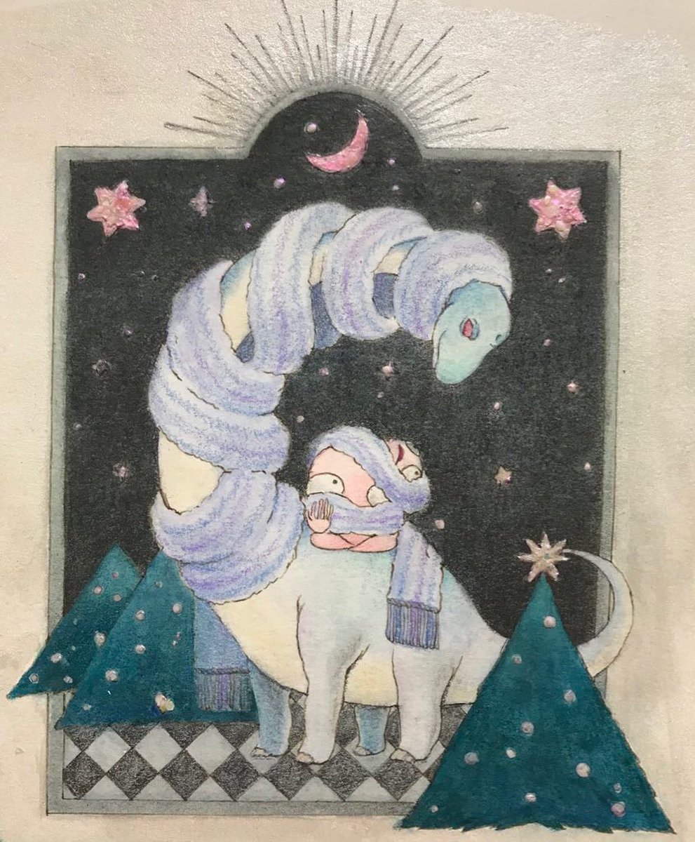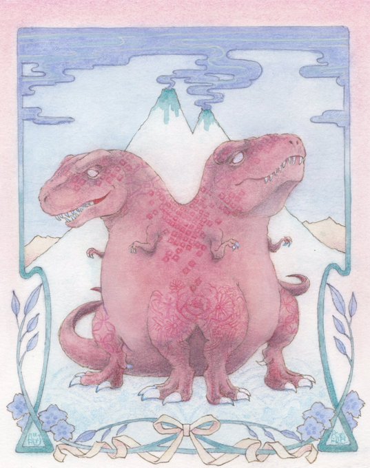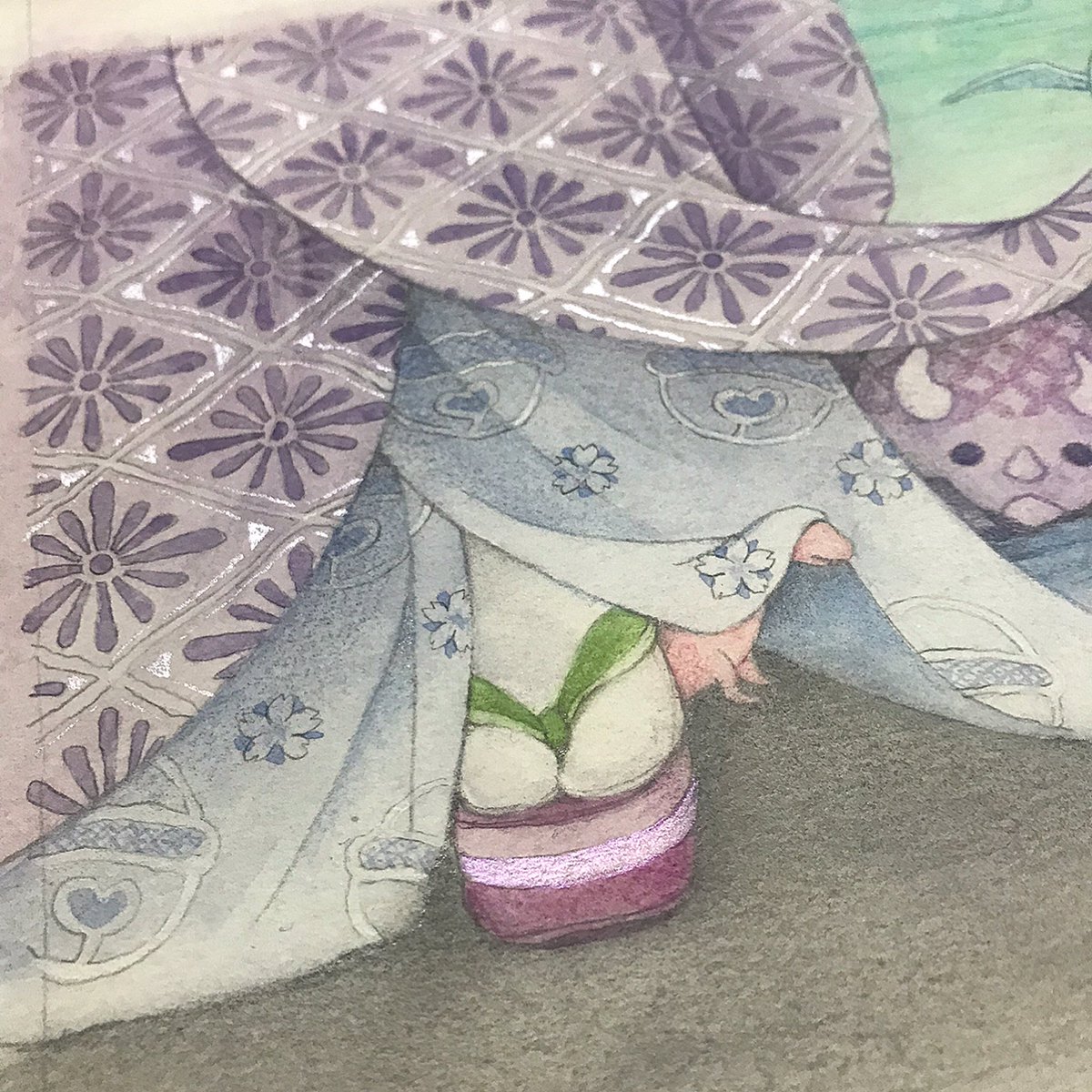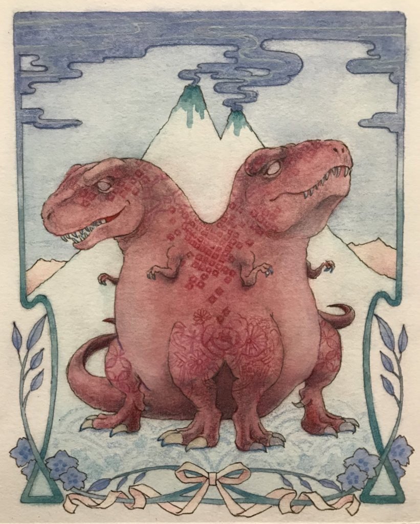 着物の影に隠れる恐竜たち。キラキラ顔彩、こっそり使っている。 #恐竜 #着物 #イラスト