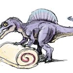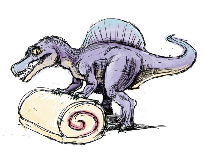 見ながら落書きしてた。スピノサウルスとプテラノドン。スピノさんが持ってるのはロールケーキです! #ジュラシックパークIII
