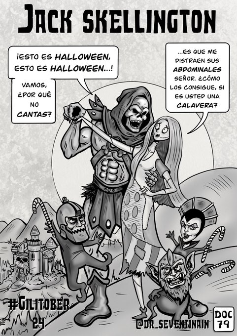 Si huele a calabazas y a pelis de miedo es que ya está aquí Halloween, y el #Gilitober 24 no iba a perdérselo. ¡Cantemos todos junto a nuestro esqueleto favorito! (Si es que el gran @KromicB nos deja sacarlo del blister) 😝 #Inktober #TimBurton #Motu #Skeletor #Fitness #fanart