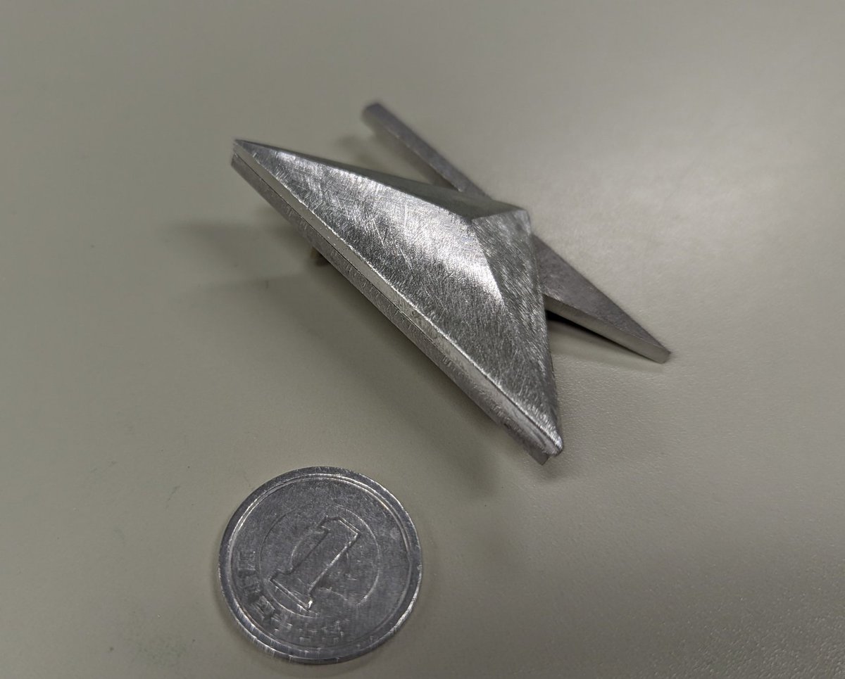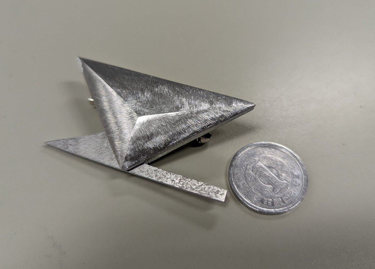 アルミ削り出しで不法侵入の灰版ピン作ってます まだヤスりやら穴開けやらラインストーンやらネジ止めやらが残ってるけどサイズ感含めてかなりいい感じ 職場にある機械を使いこなせてれば手作業の分が減るんだけどなぁ #ずっと真夜中でいいのに #ずとまよファンアート #ずとまよ