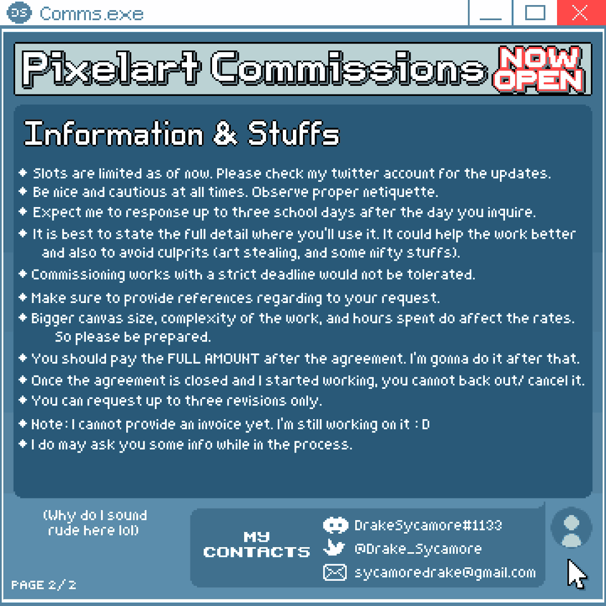 Pixelart commissions now open! Limited slots only. Check below for more details!✨✨ #pixelart #commissionsopen #drakesycamore #artph