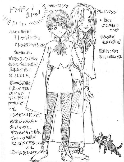 トライガン読みました記念の落書き。 教えて下さり有難うフォロワーさん方。この二人真っ直ぐで本当に好きです。 トライガンは良いぞ。