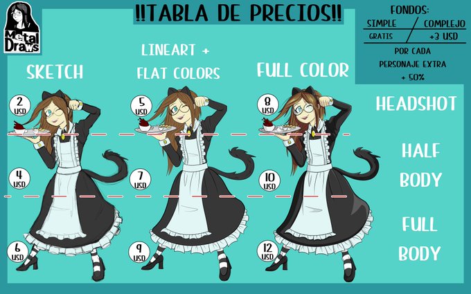 ¡¡TABLA DE COMISIONES ACTUALIZADA!! Para aquellas personitas que quieren o están planeando en pedirme una comisión, aquí les traigo los precios, información y algunas cosas mas. Cada Fav y RT se agradece muchísimo! >w< #commissionsopen #digitalart #ArtistOnTwitter