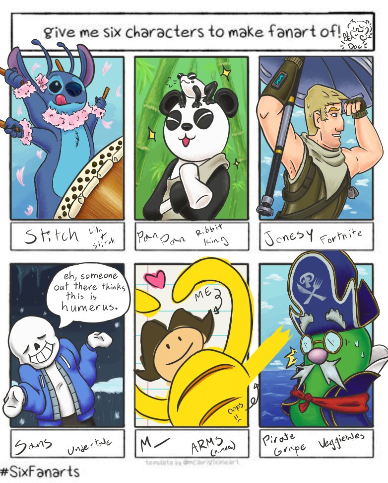 It took a hella long time, but I finally got my #SixFanarts finished! big thanks to @NetworkEra_ @DendyMolotov @LuisM47174476 @AstroNinja0 @StLXFRMR @rt_table for the prompts!