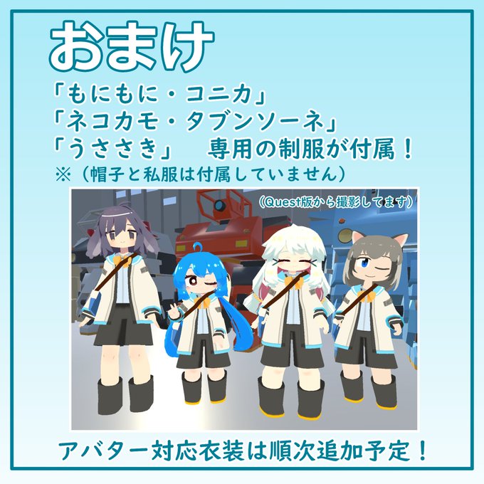 オリジナル3Dモデル『イネミ』 VRChat_Quest_Fallback対応 | DCN-ララ dcn-rara.booth.pm/items/4332778 #booth_pm #VRChat ver.1.1+2を公開しました(イネミ自体はいじっていないので) ネコカモ・タブンソーネとうささきに対応した専用衣装を追加しました! (衣装は撮影後に再調整しています)