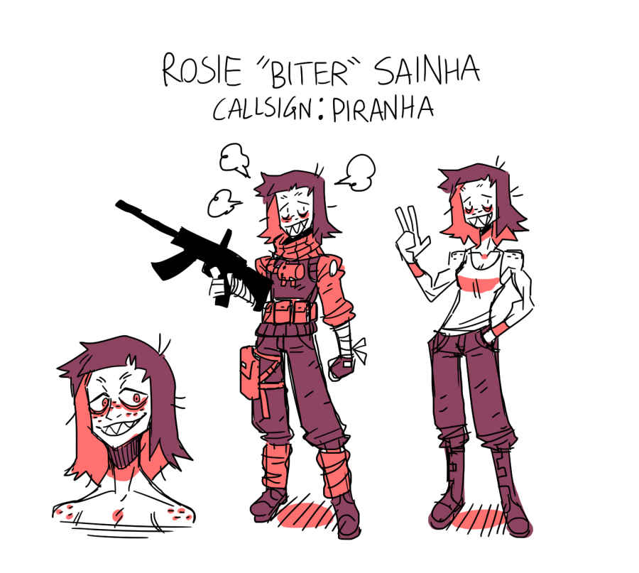 im excited so i drew my lancer. shes a former mercenary who was arrested but is serving her time as a lancer in a patrol unit (under close observation) due to her combat skills being recognized as useful. a bit of a gun nut and 6'4''. experienced in combat but new to piloting.