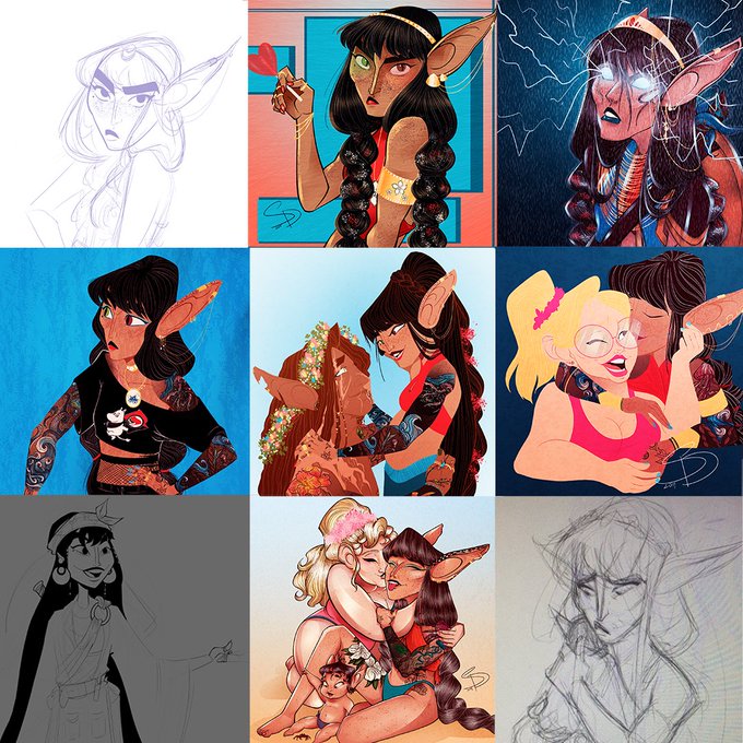 It's #PortfolioDay ! My name is Samantha and I'm queer & nonbinary 2D FX and Character Animator, Background Painter, Harmony TD and Comp artist, and Designer for animation, primarily in TV series and Games. I also love bright colors & fantasy characters with long hair.