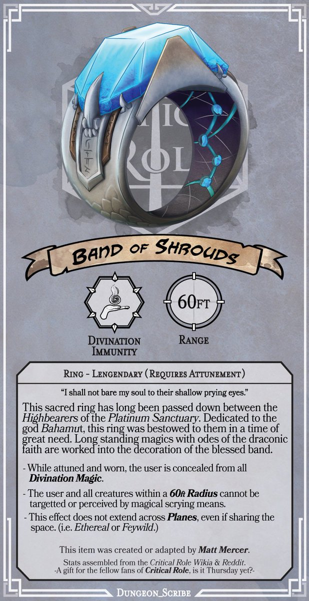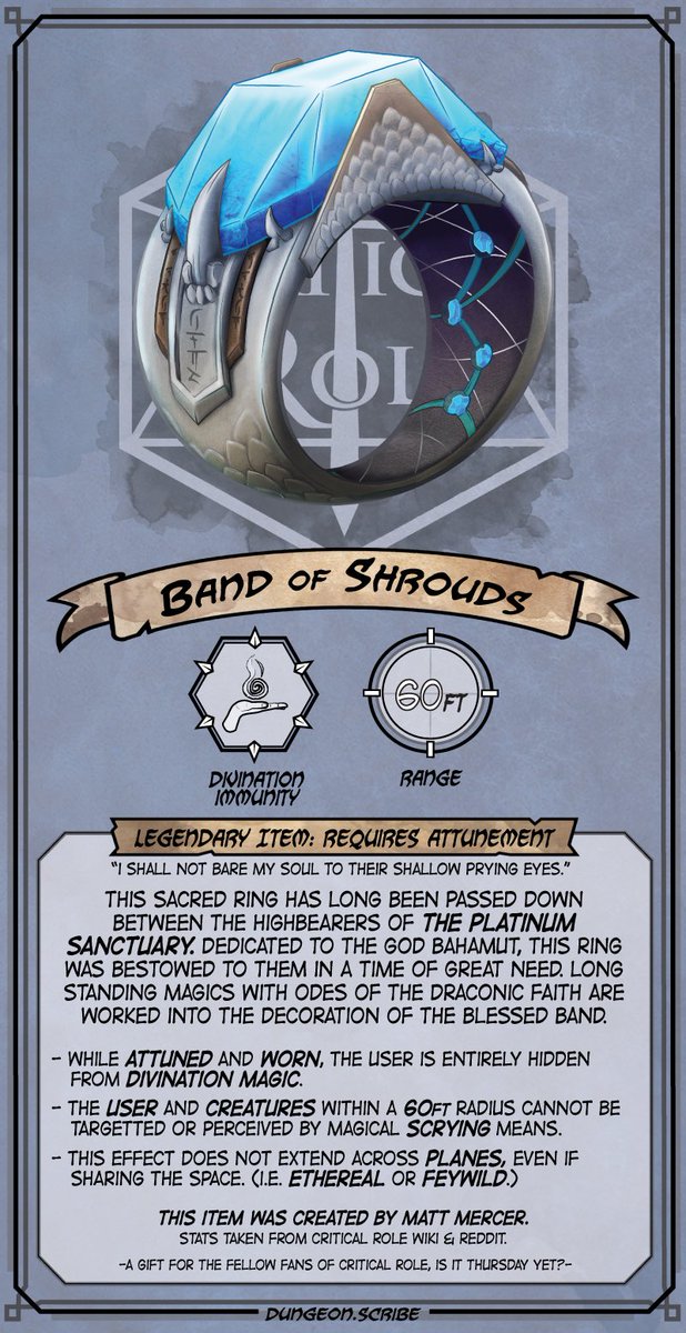 Not truly #LVMSpoilers but today covers some odds items from the first #CriticalRole campaign so tagging to be safe. There are quite a few to cover today, but to start us off! Vex's ring and a core tool in the last arc. #CriticalRoleArt 39/45: Band of Shrouds