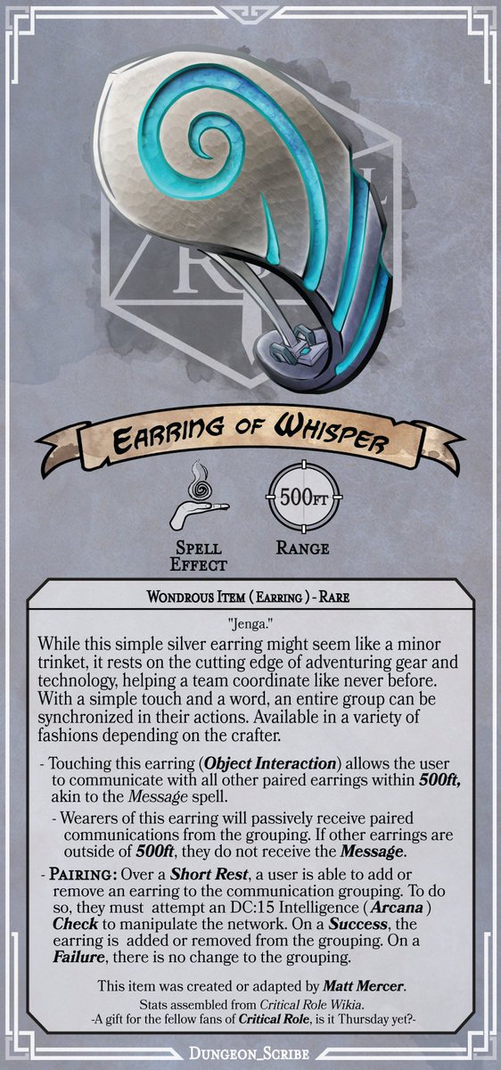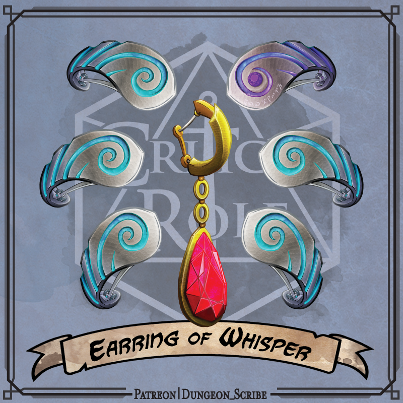 Wrapping up the last of the extra Items. This one is hit home. Its one of the longest running, useful, and tied together items from #CriticalRole. It adapted and expanded as their found family did, that hit home. #CriticalRoleArt 46/45: Earring of Whisper