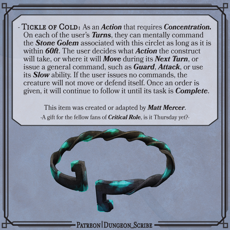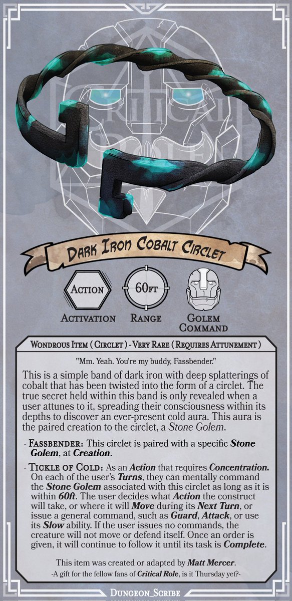 Crit Week: 2 of 3! Fassbender's Control Circlet, using Animate Dead as a filler for wording. As always, these are a free resource and I hope you enjoy them in a game. Stay safe and don't forget to love eachother. #criticalrolefanart #critrole #Criticalrole #dnd