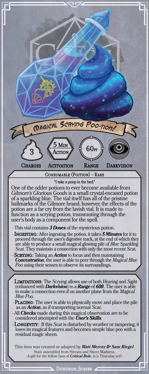 Next,Scanlan Shorthalt. Can you believe it's been over 2years, and I haven't had an occasion to use the Poop Icon? As with the others, diving back into #CriticalRoleArt to update item cards for the #TheLegendofVoxMachina! @samriegel I treasure you. 27/45: Scrying Poo-tion.
