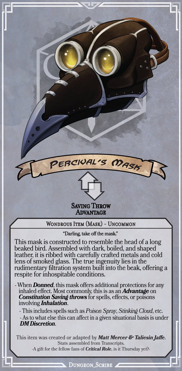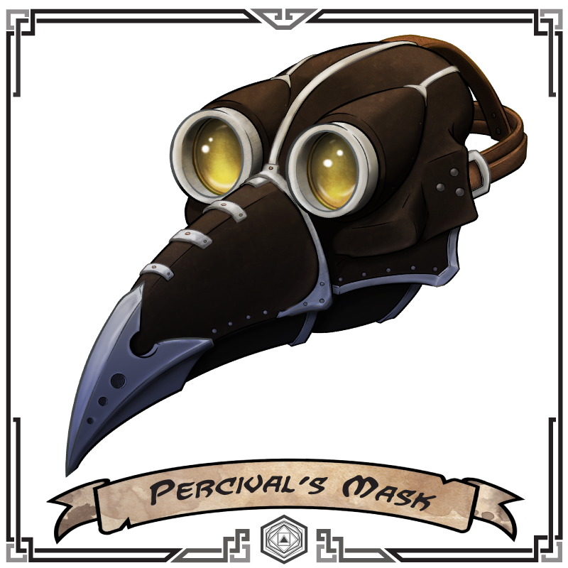 Starting off the AM #CriticalRole with Percy! The Pepperboxes are allready done but he has a good amount of items to come. Art is older but all of the cards are updated for home game use. Enjoy! #CriticalRoleArt 31/45: Percival's Mask (Plague Doctor)
