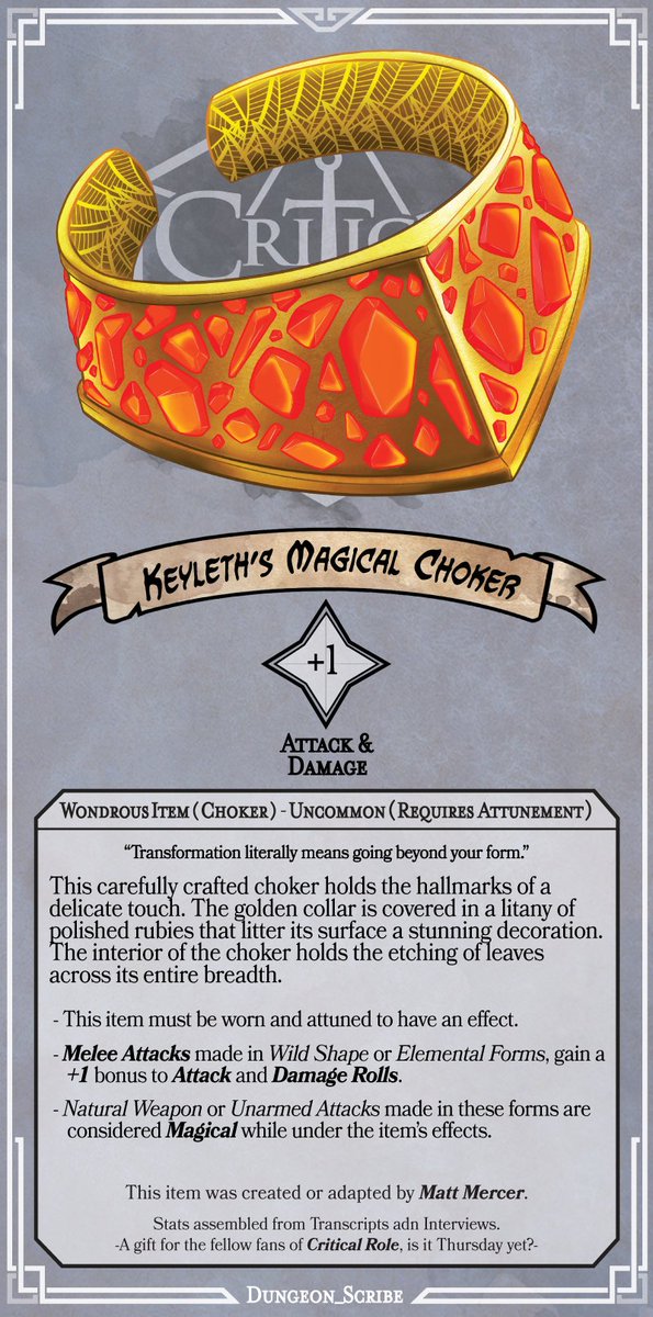 Another lesser known from the launch. It is so good that I was shocked it wasn't 5e standard. I can still remember drawing those countless little leaves. A must have for Circle of the Moon Druids! #Keyleth #CriticalRoleArt 37/45: Magical Choker