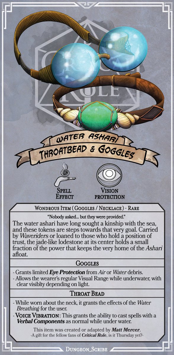 Okay, deep #LVMSpoilers becuase of Water Ashari. This was one of the funniest and well timed gifts in the run, in my opinion. 'No one asked.' Got a firm chuckle. #CriticalRoleArt 41:45: Water Ashari - Throatbead & Goggles