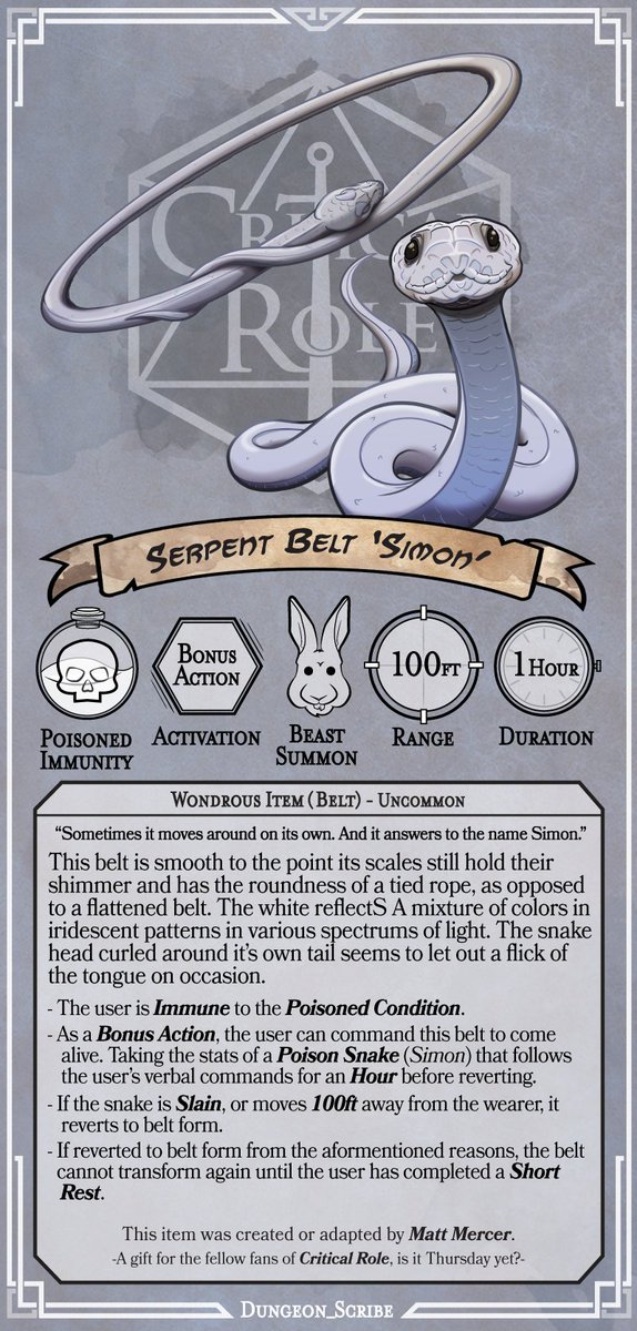 And now, the real star of the show. I've always been a big fan of Simon & I was even able to gift @VoiceOfOBrien a card. I couldn't be happier with how it turned out, even years later. Includes stat block! #CriticalRoleFanart #CriticalRole 43/45: Simon the Serpent Belt