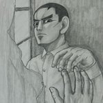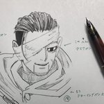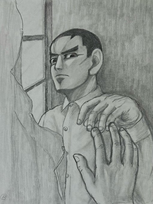 #金カムアナログイラスト部 鉛筆とシャーペンで描く最推し 推しが複数居るので白黒が似合いそうな関谷氏の夢?絵 試練に苦しむザマをゴミを見るような目で見つめられたい🥹 縋ろうとするところをぺって引き剥がされたいな💕