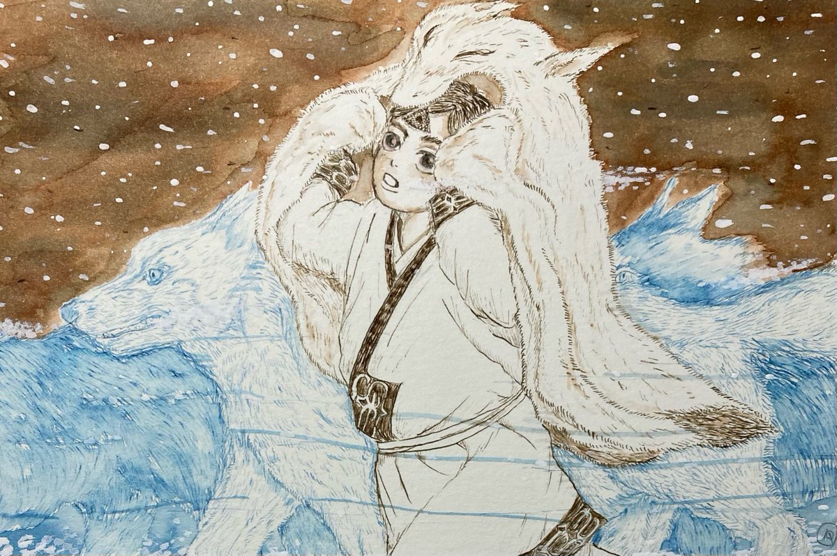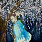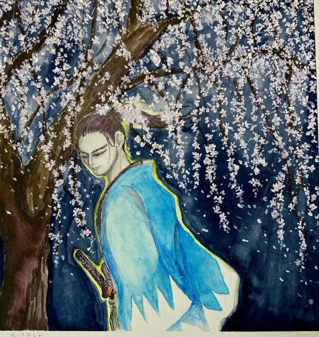 #金カムアナログイラスト部 お題【花とキャラ】 開催おめでとうございます お花描く機会をいただきありがとうございます✨ 枝垂れ桜と若土方さんです 鉛筆・顔彩・インク・銀マッキー・胡粉・キラキラグリッター等使用 用紙:ヴィフアール細目
