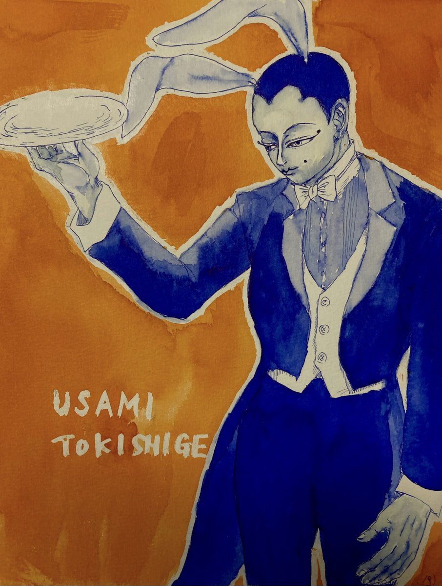 #ゴールデンカムイ版深夜の真剣お絵描き60分一本勝負 お題【推しキャラ】 宇佐美 Bunnyman お盆に何か乗せようか迷いつつ描いて結局何も乗せませんでした 青とオレンジのインク2色使用
